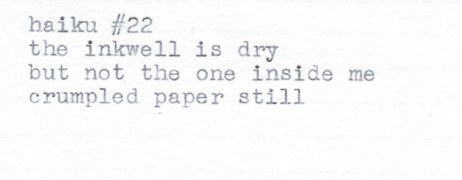 Haiku #22September 6, 2025Dan RomanSep 06, 2025ShareShare Dan Roman's SubstackShare Dan Roman's SubstackDan Roman's Substack is a reader-supported publication. To receive new posts and support my work, consider becoming a free or paid subscriber.Subscribehaiku #22the inkwell is drybut not the one inside mecrumpled paper stillPreviousNext