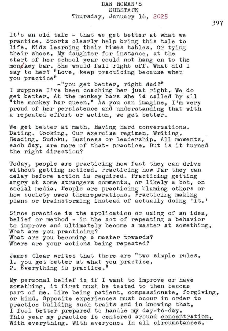 We get better at math. Having hard conversations. Dating. Cooking. Our exercise regimen. Writing. Reading. Sudoku. Business or leadership. All moments, each day, are more of that - practice. But is it turned the right direction?
