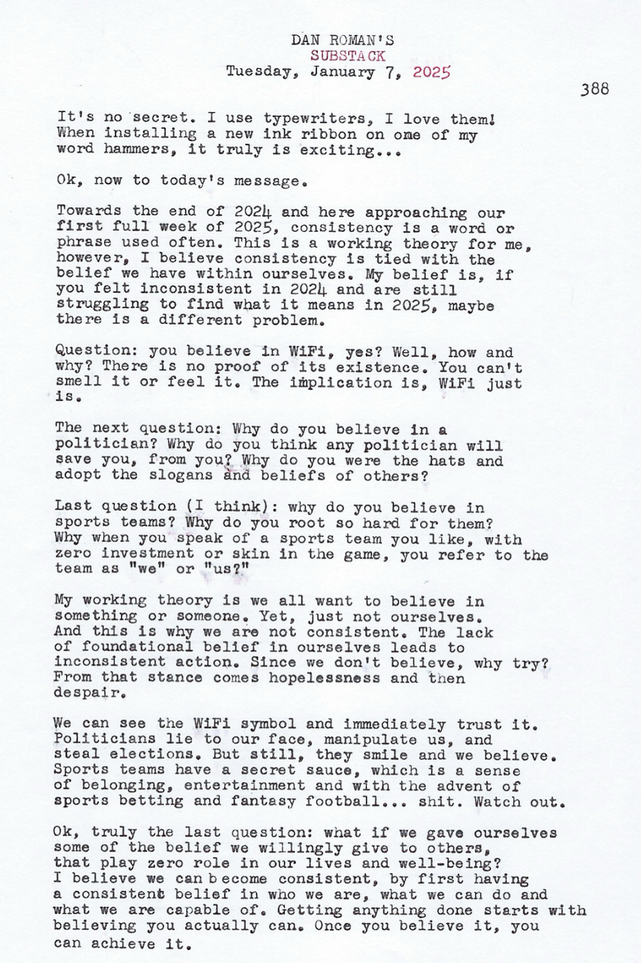 Ok, now to today's message. Towards the end of 2024 and here approaching our first full week of 2025, consistency is a word or phrase used often. This is a working theory for me, however, I believe consistency is tied with the belief we have within ourselves. My belief is, if you felt inconsistent in 2024 and are still struggling to find what it means in 2025, maybe there is a different problem.