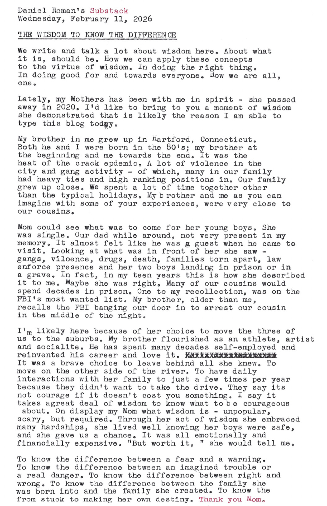 To know the difference between a fear and a warning. To know the difference between an imagined trouble or a real danger. To know the difference between right and wrong. To know the difference between the family she was born into and the family she created. To know the difference from stuck to making her own destiny. Thank you Mom.