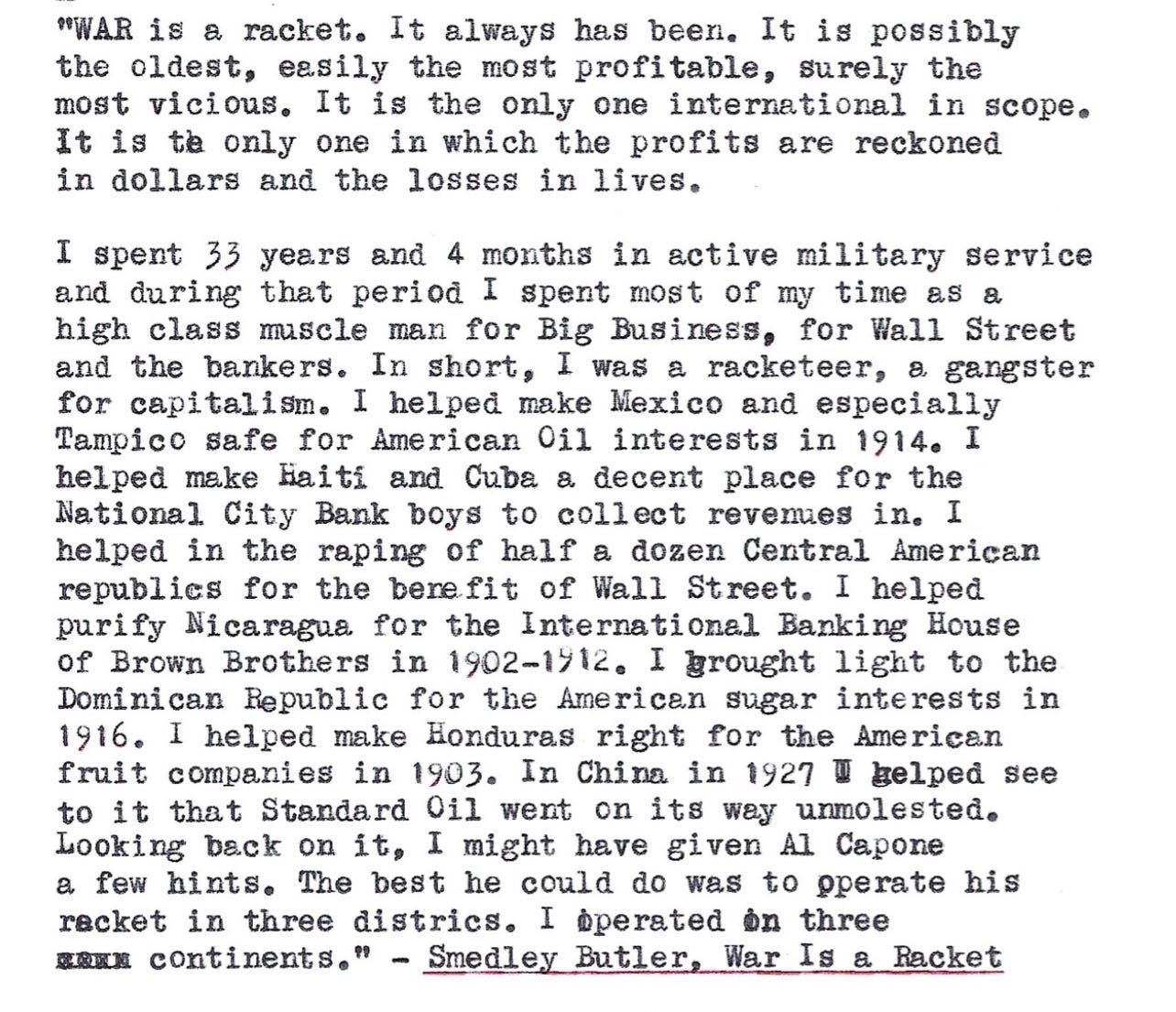 I spent 33 years and 4 months in active military service and during that period I spent most of my time as a high class muscle man for Big Business, for Wall Street and the bankers. In short, I was a racketeer, a gangster for capitalism. I helped make Mexico and especially Tampico safe for American Oil interests in 1914. I helped make Haiti and Cuba a decent place for the National City Bank boys to collect revenues in. I helped in the raping of half a dozen Central American republics for the benefit of Wall Street. I helped purify Nicaragua for the International Banking House of Brown Brothers in 1902-1912. I brought light to the Dominican Republic for the American sugar interests in 1916. I helped make Honduras right for the American fruit companies in 1903. In China in 1927 I helped see to it that Standard Oil went on its way unmolested. Looking back on it, I might have given Al Capone a few hints. The best he could do was to operate his racket in three districts. I operated on three continents.” - Smedley Butler, War Is & Racket