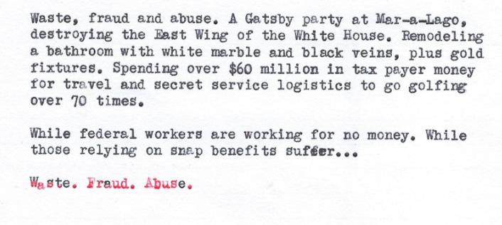 Waste, fraud and abuse. A Gatsby party at Mar-a-Lago, destroying the East Wing of the White House. Remodeling a bathroom with white marble and black veins, plus gold fixtures. Spending over $60 million in tax payer money for travel and secret service logistics to go golfing over 70 times.