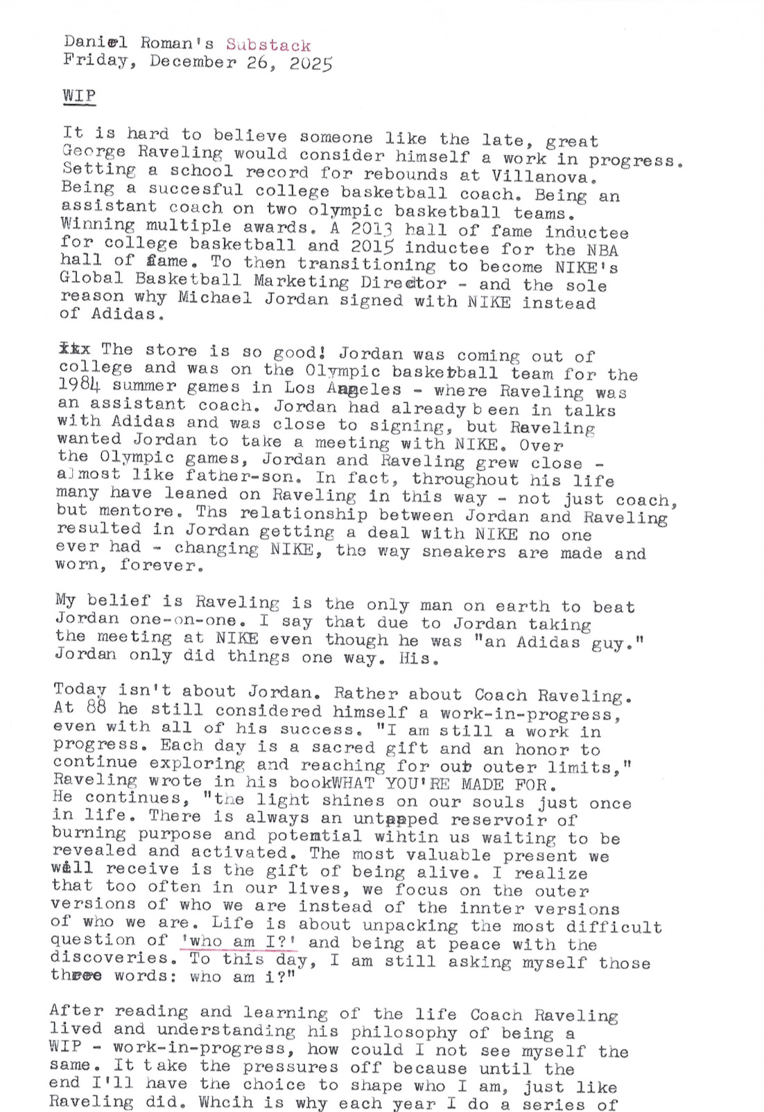 After reading and learning of the life Coach Raveling lived and understanding his philosophy of being a WIP - work-in-progress, how could I not see myself the same. It takes the pressures off because until the end I’ll have the choice to shape who I am, just like Raveling did. Which is why each year I do a series of challenges, to work on myself. To improve. To give myself a chance on getting better. To remind and humble myself - “I am a work-in-progress.” To shed all the assumptions and opinions and back it all with action. Because being alive is a gift - and I can’t waste it. There is so much within me to work on, to learn about and to give.