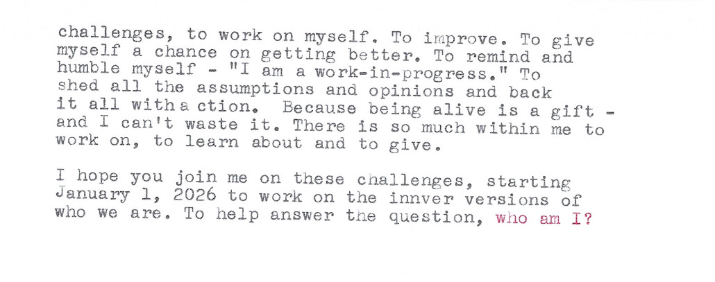 I hope you join me on these challenges, starting January 1, 2026 to work on the inner versions of who we are. To help answer the question, who am I?
